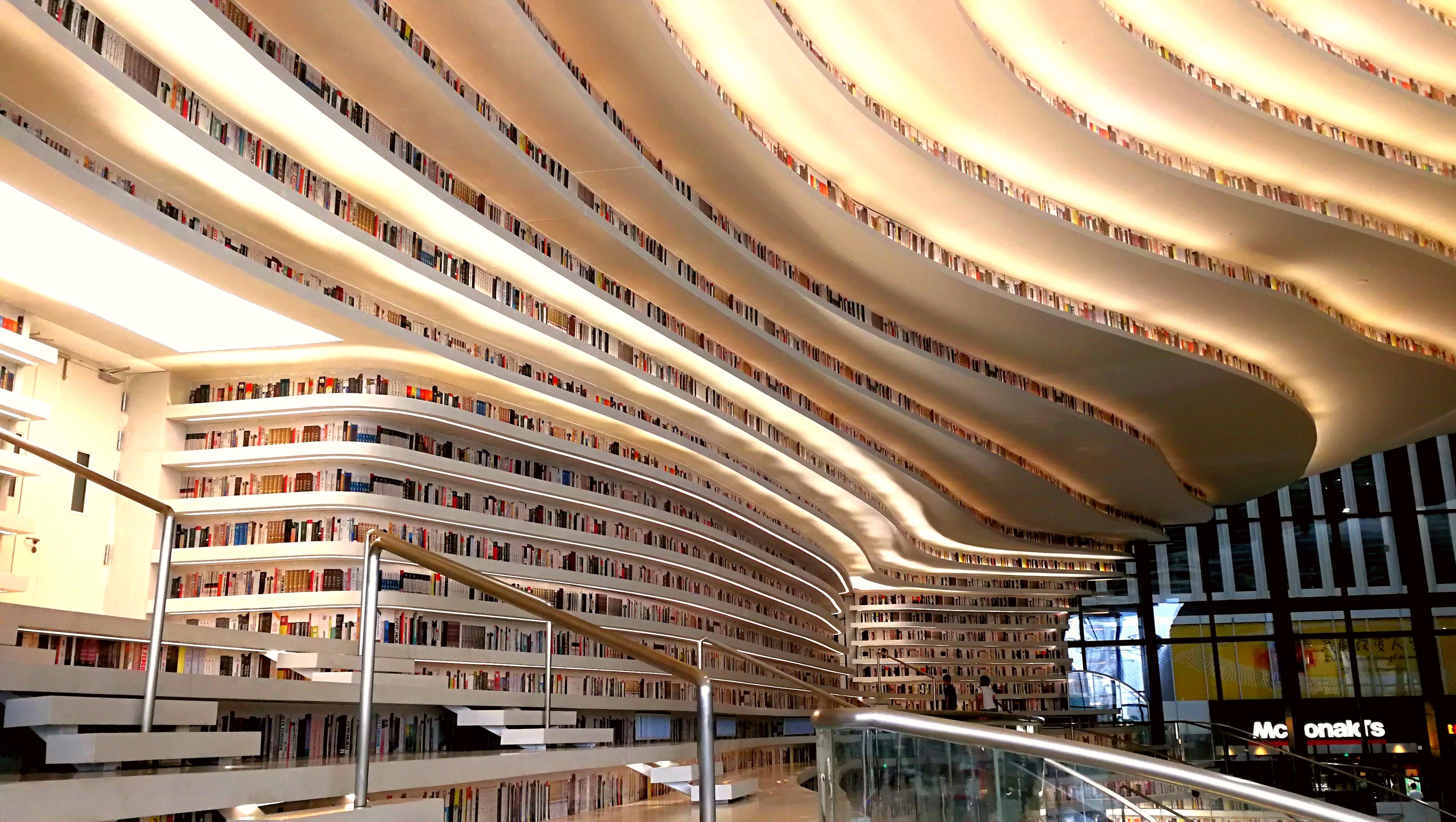 滨海图书馆。因其极具“科幻感”的设计而在朋友圈和各大媒体刷屏,被网友成为“中国最美图书馆”甚至是“亚洲最美图书馆”。这里没有传统图书馆的约束感,绝对是一个凹造型的好去处。设计独特之处就是“滨海之眼”和中庭的“书山”造型。在这里书架与座椅完美的融为一体。