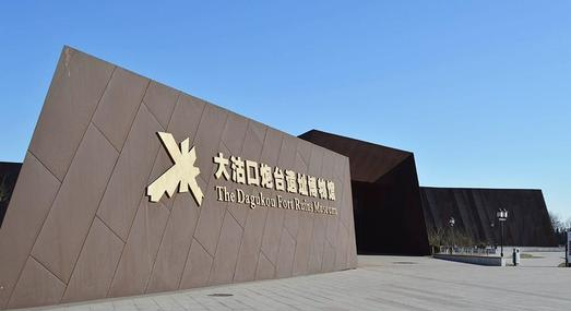 大沽口炮台遗址博物馆是展现中国近代史上帝国主义入侵,民族不畏列强、抵御外犯的民族教育和青少年教育基地。博物馆建筑的造型很独特,是一个放射状的金属建筑,寓意为爆炸的炸弹,整个建筑的外表是铁锈色,显得沧桑古老。参观完博物馆后从出口向东步行几十米,即可看到一座高高的炮台,在城墙之上一座大炮和几个小炮对准海面,沧桑壮观。