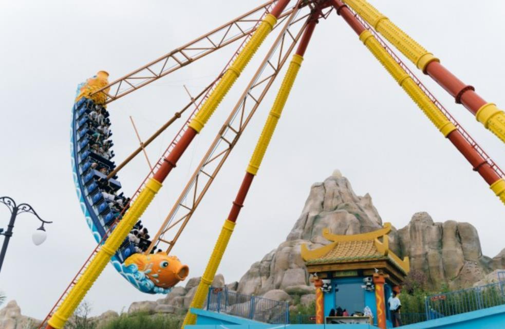 “本是三尺寻常鲤,逆流欲向天上游”,这个形容非常贴切。谁能想到它竟然是个海盗船项目,只不过是鲤鱼形状的座椅。向上跃的时候,鱼尾的座位快接近90度垂直的角度了。