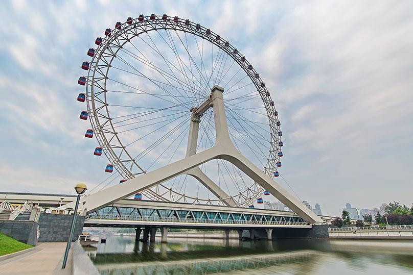 天津之眼坐落在天津市红桥区海河畔,是一座跨河建设、桥轮合一的摩天轮,兼具观光和交通功用。摩天轮旋转一周所需时间为28分钟,到达最高处时,周边景色一览无余,甚至能看到方圆40公里以内的景致。
