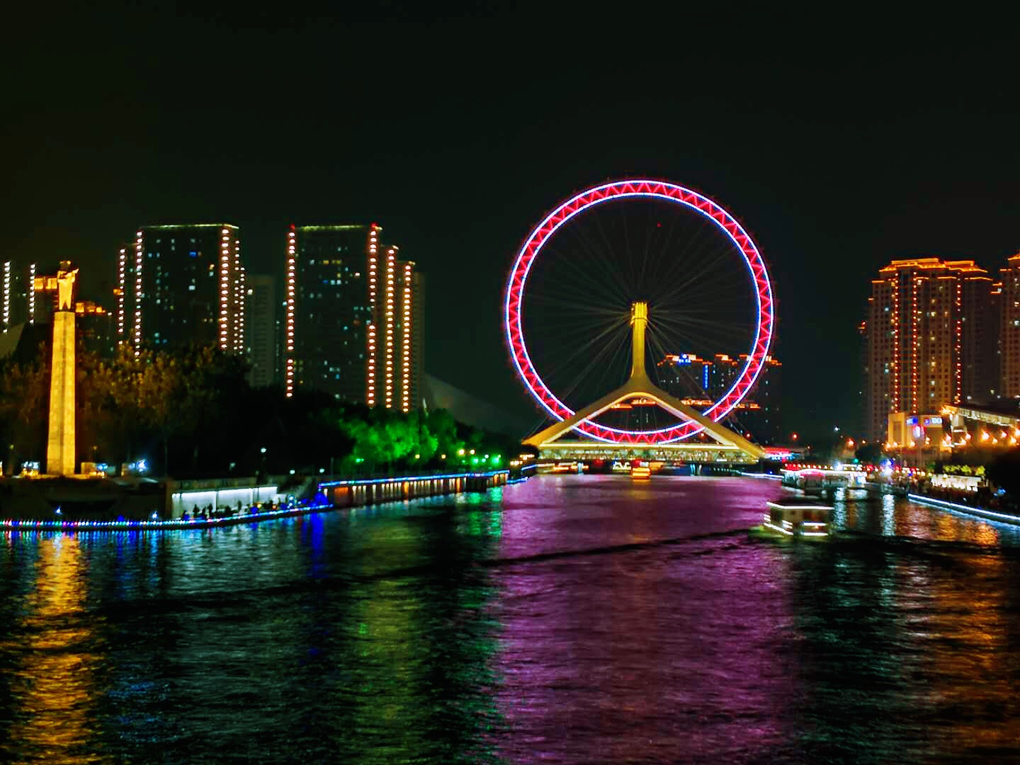 天津之眼全称天津永乐桥摩天轮,跨海河连接河北区与红桥区,是一座跨河建设、桥轮合一的摩天轮,兼具观光和交通功用。天津之眼是世界上唯一一个桥上瞰景摩天轮,是天津的地标之一。摩天轮直径为110米,轮外装挂48个360度透明座舱,每个座舱可乘坐8个人,可同时供384个人观光。摩天轮旋转一周所需时间为28分钟,到达最高处时,周边景色一览无余,甚至能看到方圆40公里以内的景致,被誉为“天津之眼”。