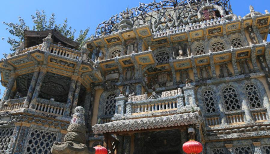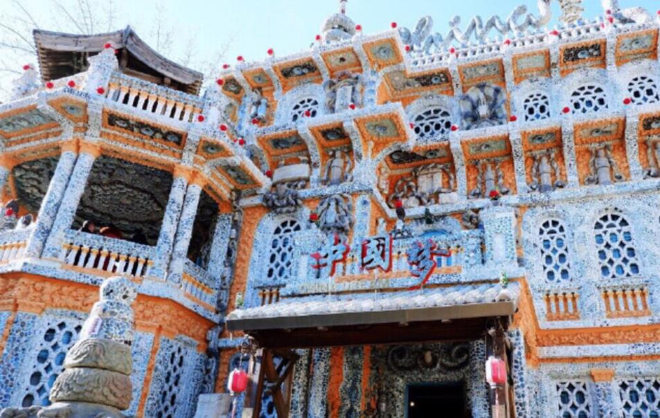 瓷房子的围墙由数百个民国时期和晚清时期的古瓷瓶垒砌串联而成,名平安墙。房顶用古瓷片拼成的巨龙盘旋出“China”的图案,巨龙后是碎瓷片拼出的2008年奥运主体育场。注意看房子外围右侧,有一竖排的瓷猫从顶层延伸到一层墙角,瓷猫周边镶嵌满水晶、玛瑙,如此兴师动众装饰的却是一根下水管道,令人赞叹。