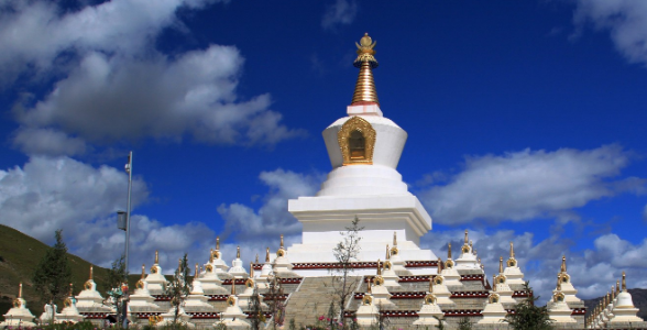 稻城白塔海拔约3740米,位于四川省稻城县,又称尊胜塔林、胜利塔,藏语叫郎杰曲登。据说,当年释迦牟尼涅槃之时,众多眷属祈求世尊法身长驻,佛陀便嘱修尊胜塔,并亲自加持开光,以此代表法身。