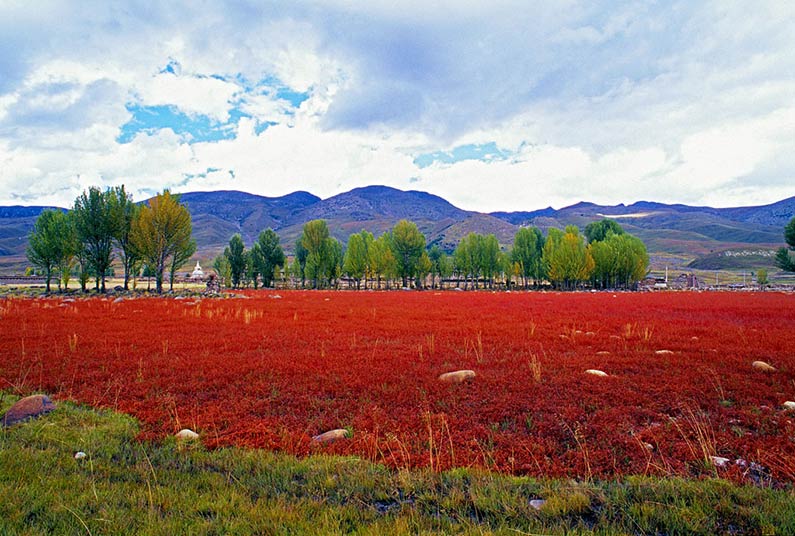 据以往观察,稻城亚丁红草地在每年的10月初的时候开始慢慢的变红,在10月15日到20日期间是最艳丽的,过了这段时间红草地就变成了枯黄的一片。在每年的10月15日左右到达这里,一片红彤彤的景致映入游客的眼帘,红得那么热烈,那么艳丽,也那么醉人。在或黄或绿的白杨树的衬托下,灿灿生辉,妩媚无比。