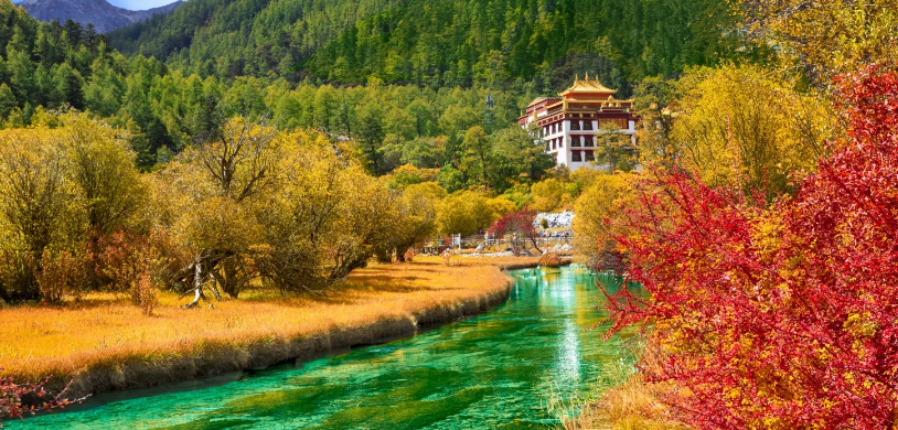 在稻城县城以北28公里处,桑堆镇公路边,有一个不起眼的小水塘,每年秋天布满了红色的水草,这里便是稻城亚丁美丽的红草地。生长在水中的红草,大都疏密相间,像灌木枝扎根在水池中。这些红草在阳光的照射下,紫里透红,非常吸引眼球。海子里有一些散落无序的顽石点缀其间,平添几多浪漫。远处山腰斜坡上硕大的藏文六字真言,发散着一种雪域高原的神秘与庄严。池塘对岸笔直矗立着一排黄绿错落的杨树,水中红草依依,白杨婀娜,加之倒映着的白云、蓝天和远处的山峦,彼此辉映出一幅色彩交织的绚丽图画,美得令人陶醉。
