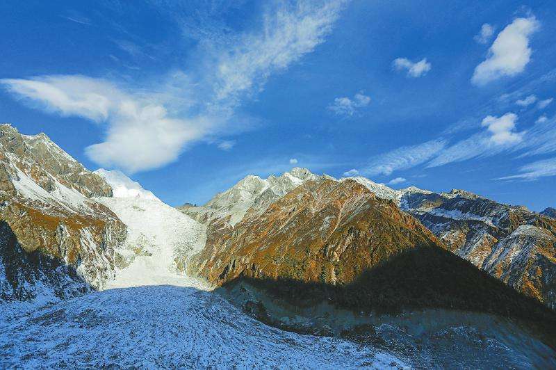 海螺沟大冰瀑布位于海螺沟冰川的上端,是一个巨大的陡壁。当冰川运动到这里,便成瀑状下降,形成一个巨大的固体冰坝。大冰瀑布高1080米,宽1100米,是我国最高最大的冰瀑布,相当于黄果树瀑布的15倍。这个巨大无比的固体冰瀑,仿佛从蓝天直泻而下的一道银河,像顶天立地的巨大银屏,屹立在冰川上。