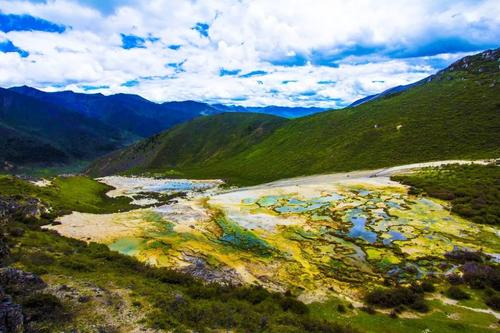 泉华滩是一种并不多见的喀斯特地形,也许去过黄龙的蜂蜂会觉得眼前的钙化池似曾相识,但泉华滩更显神秘美丽。她藏匿于一个三面环山的凹谷之中,从另一个山头倾斜下来大片的白色钙化土,延伸到谷底后便变化出四层五彩的钙化池,宛如仙境。