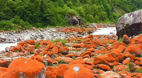 红石的生长有这样一些奇怪的特点:阳光照射不到的地方没有,远离海螺沟主河道的林地中没有,海拔2100米以下的位置没有,而且带出海螺沟的红石都会死掉变黑。红石上的生命体每时每刻都在生长,不同的季节和天气情况下,红石的色泽深浅不同。也正因此,红石总有无穷无尽的绚丽色彩,一年四季都能构成不同的美妙画卷。