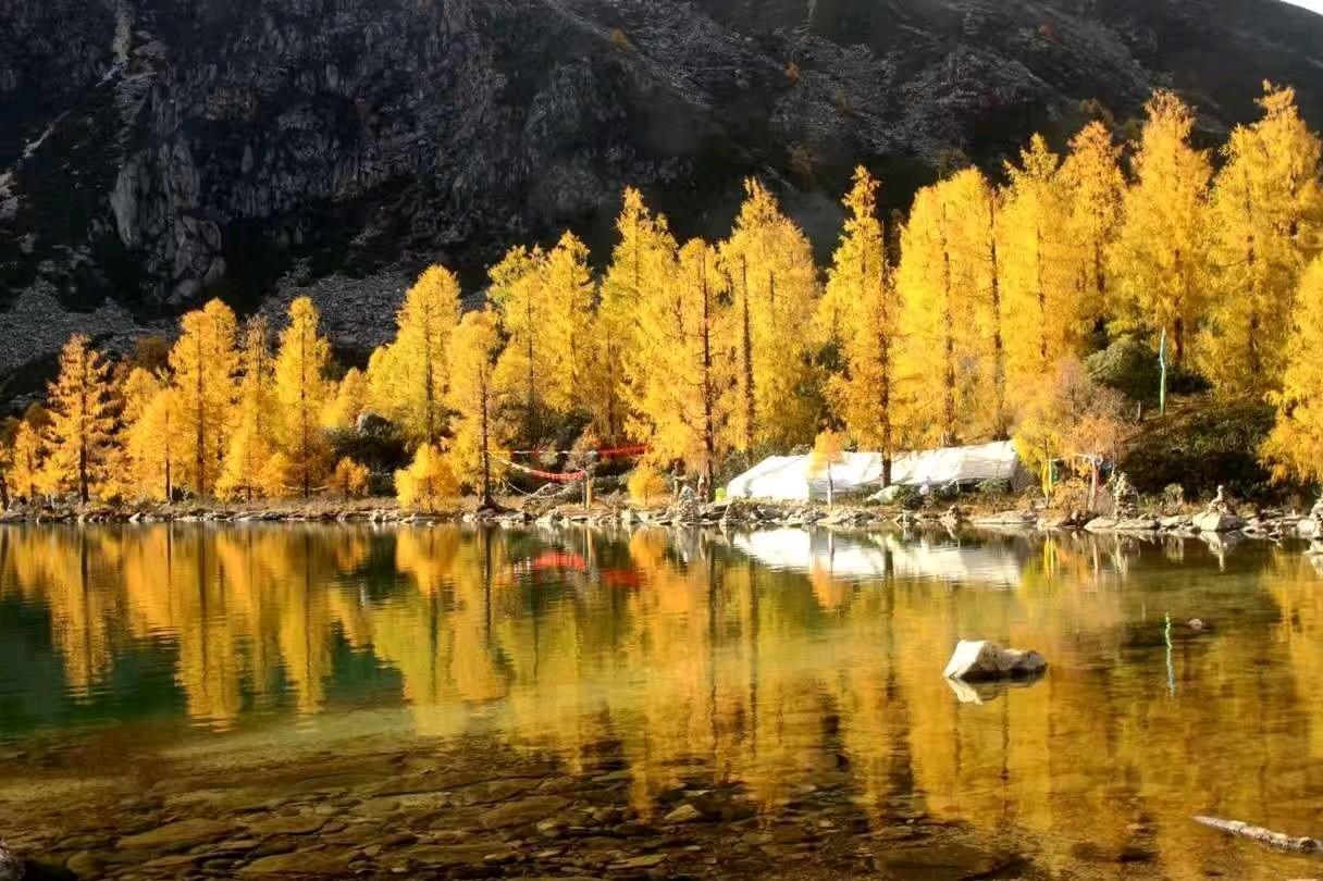 葫芦海是第四纪冰川退却后形成的高原屏障湖,是葫芦如镜小提琴。湖水清澈平静,倒影奇妙,光线奇特,颜色各异。在海子的旁边,一棵红杉挺拔而强壮,浓密而能干的针叶从绿色变成红色。