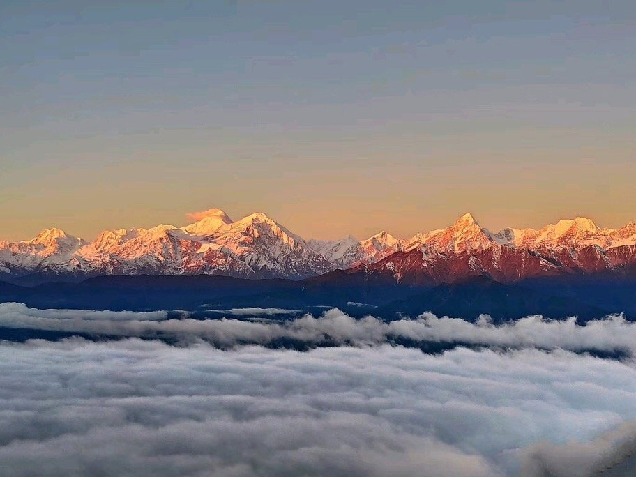 华尖山与牛背山海拔相差无几,且距离贡嘎雪山更近,这里的日出一样的壮观。徒步4个小时便可到达山顶,眼前云海一望无际,云雾沿着河谷上升,从两侧的山脉溢出,会形成壮观的云瀑。