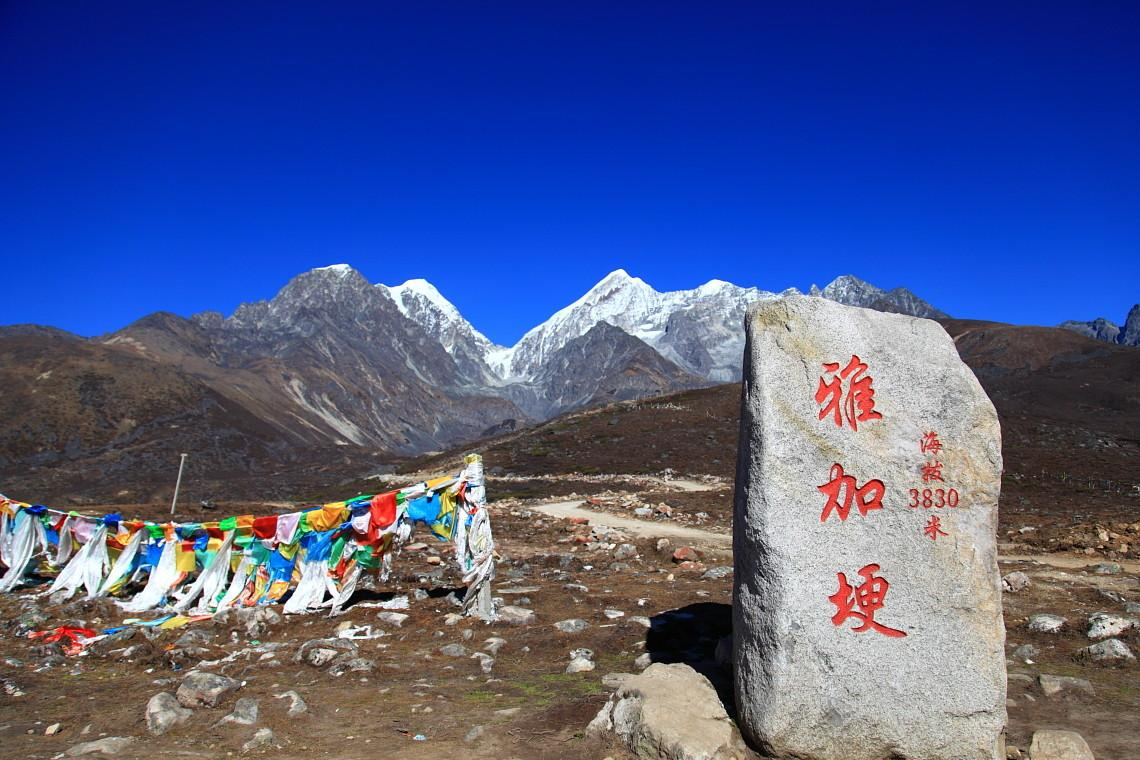 “情海”雅家情海出来就直奔雅家埂. 雅家埂地处贡嘎山海螺沟景区范围内,位于康定老榆林和海螺沟磨西镇之间,贡嘎山东坡的北部,雅家埂河上游,是贡嘎山脚下又一颗光耀夺目的明珠。自古以来就承载着内地与藏区的联系纽带作用,雅家埂身上环绕着“唐蕃古道”与“茶马古道”的双重光环。雅家埂景区被很好地封存在海拔3500至4000的地区,终年不化的雪山、瀑布、草甸、各色各样的杜鹃花、冷杉林。海螺沟十八景之红石献寿展现的便是雅家梗的神奇红石景观。来到雅家埂丫口附近. 伸手可触天,人在云中走,云在脚下飘,就象在腾云驾雾,非常美妙.最后下山来到红石滩, 雅家埂的红石滩是世界上规模较大的红石滩之一,石头上生长的呈铁锈红的物质是一种极稀有的藻类(地衣的复合体),在湿度、温度、气候适宜的情况下,这种植物就会在岩石的表面自然生长,大概四五年后就会死亡,然后再生。 雅家梗的红石是大自然赠送给贡嘎山地区最珍稀的物种之一。这里的红石面积广,颜色鲜红,顺着山谷延绵不绝,气势宏伟。冰川河岸上的每一块石头都被披上了一件件红色外衣,红石在河流两旁堆积,成群的红石变成一种流动的红色,与清洌的流水相伴顺流而下,让人感叹大自然的造化神奇。红石表面的红色物质是有生命的,只能生长在空气毫无污染的地方,让你不知不觉地进入了一个奇异的生命世界。