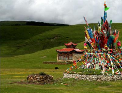 龙灯草原在甘孜州道孚县龙灯乡境内,海拔3500米,分布于川藏公路两侧,坦荡宽阔,形如吉祥八宝图。当年格萨尔王曾在龙灯大草原安营扎寨,因而这片草原在藏语叫作“格萨尔通”,意为“格萨尔王征战过的草原”。