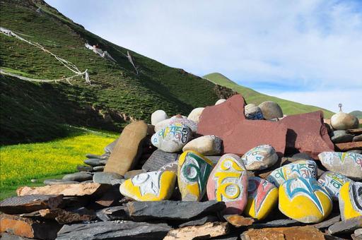 玛尼堆,藏语称“朵帮”,就是垒起来的石头之意。这些石块和石板上,大都刻有六字真言、慧眼、神像造像、各种吉祥图案,它们也是藏族民间艺术家的杰作。