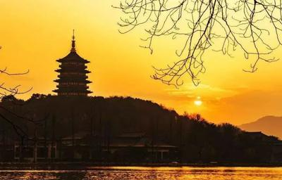 雷峰夕照,位于浙江省杭州市西湖湖南、净慈寺前的夕照山上,西湖十景之七,因晚霞镀塔,佛光普照而闻名。雷峰塔建于五代(975),是吴越国王钱弘俶为庆祝黄妃得子而建,初名黄妃塔。