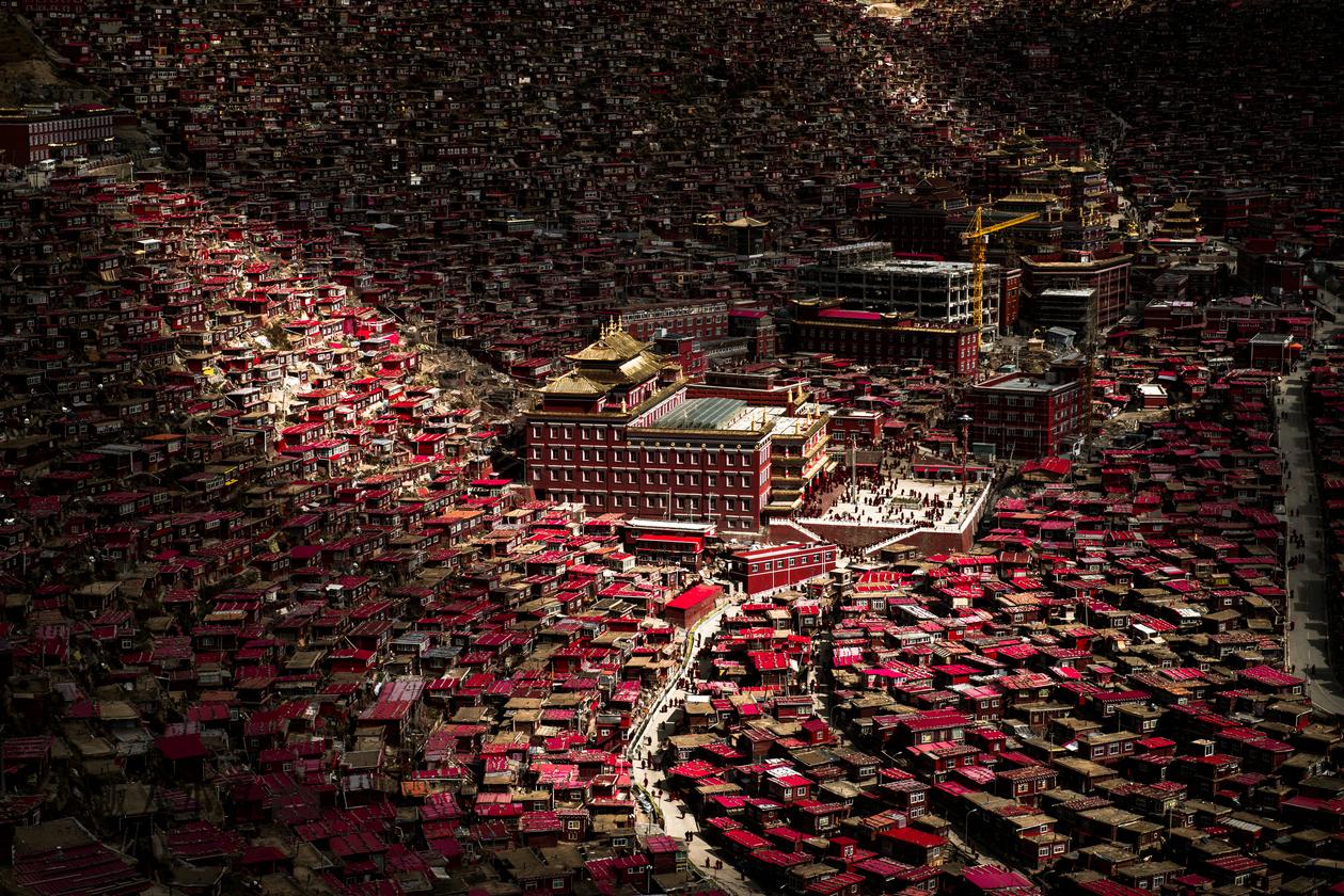五明佛学院距离色达县城有20公里左右,车不能开进去,只能停在底下的停车场。这个时候,有两种选择,直接自己一路爬上去,爬到山上的全景观景台。另一种就是坐三块钱十多分钟车程的公交车,公交车坐到半山腰,再继续爬上去。