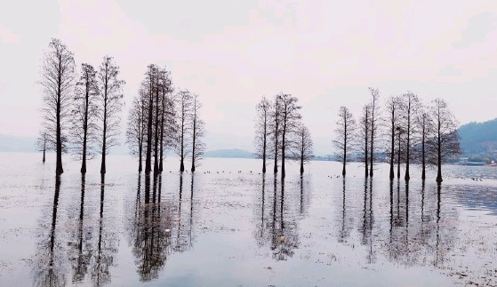 据了解,这片池杉林是上世纪五十年代,四明湖水库开始建设的时期种下的,一年四季,都有不同的色彩和景观,是余姚人出游的重要景点,如今更是吸引了无数周边各地的游人前来游玩赏景。这些大树的树叶不是水杉那种典型的羽状对生条形叶,而是长长的钻形叶,所以这片树林绝大多数是池杉。几百米的湖岸线,放眼望去就是一大片橙红的池杉,时不时飞来白鹭,微风吹来,湖面波光粼粼,树枝随风摇动,美到令人窒息。