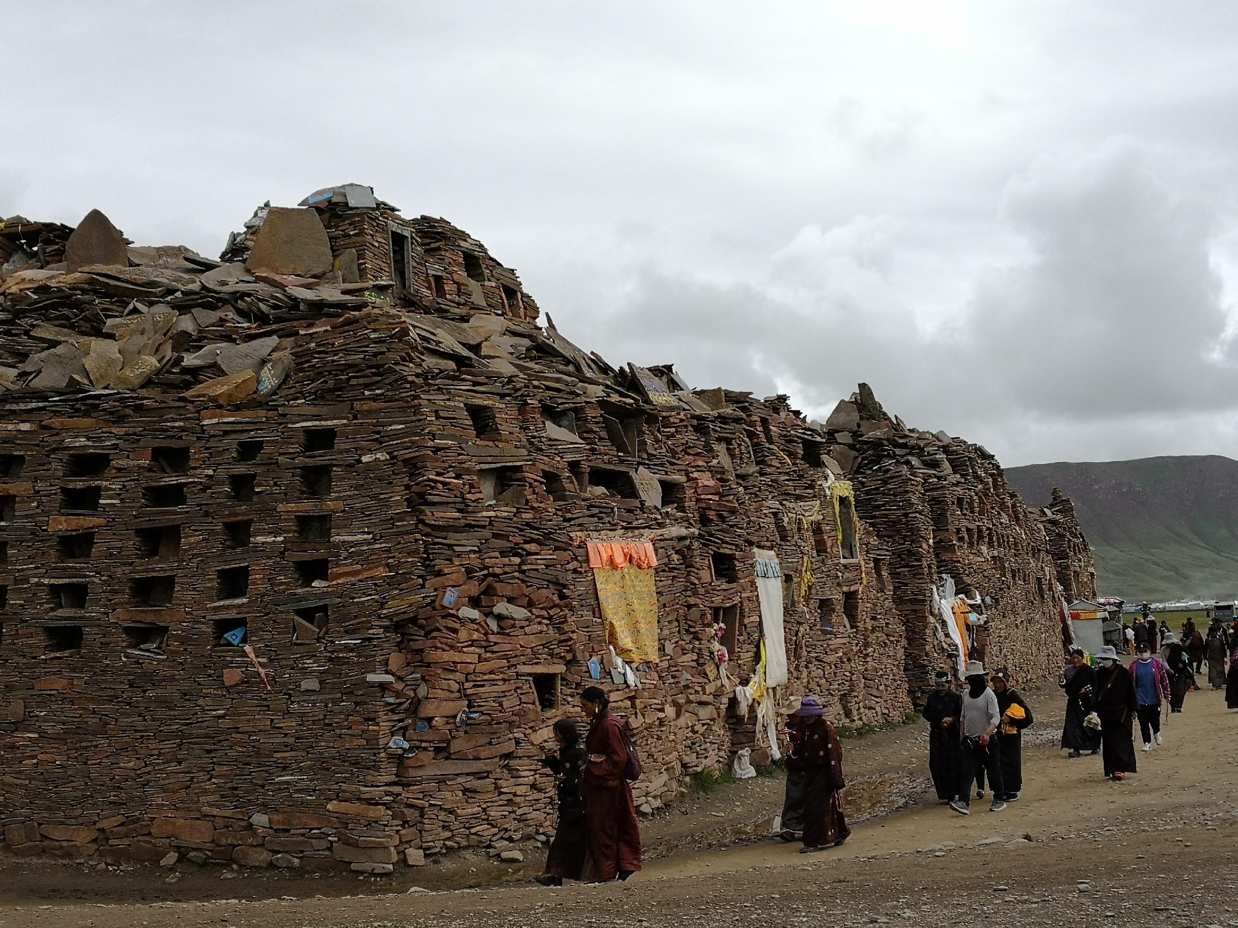 由于石块垒得太高,地面已不堪重负而下沉,据说它地面上的部分有多高,陷入地底下的就有多深,因此,尽管人们仍在不断地往上放石块,可嘛呢城并不见明显的增高。最让人觉得不可思议的是,这个没有任何框架支撑,也没用任何粘合剂,完全是人们你一块我一块随意堆砌起来的城楼,竟然能够历经千年岿然不动,这不能不说是一个奇迹。像这样的石经城在藏区也是绝无仅有的。据传此城起源于格萨尔时期.还留有许多当年的遗迹。为了替战死疆场的士兵超度灵魂,将士们在此垒了一个嘛呢堆。后来老百姓因为缅怀格萨尔王的功绩,纷纷来此朝觐,嘛呢堆越来越大,越垒越长,最后形成了嘛呢城。直到每天仍有不少来朝圣的人围着城墙一步一拜地磕着长头,表达着他们对传奇英雄格萨尔王的无限景仰和怀念,也寄托着他们对明天的向往与企盼。