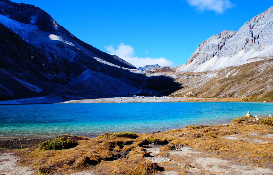 牛奶海是亚丁地区的圣湖之一,位于央迈勇神山下,海拔4600米。牛奶海湖水深浅不一,近岸由于湖底远久植物的沉淀而略显黑色,往里面一些则是浅绿色的一带,再深处则是碧绿色的水面,蓝得透亮。阳光照耀在静静的湖面上,水面如宝石般熠熠闪光。