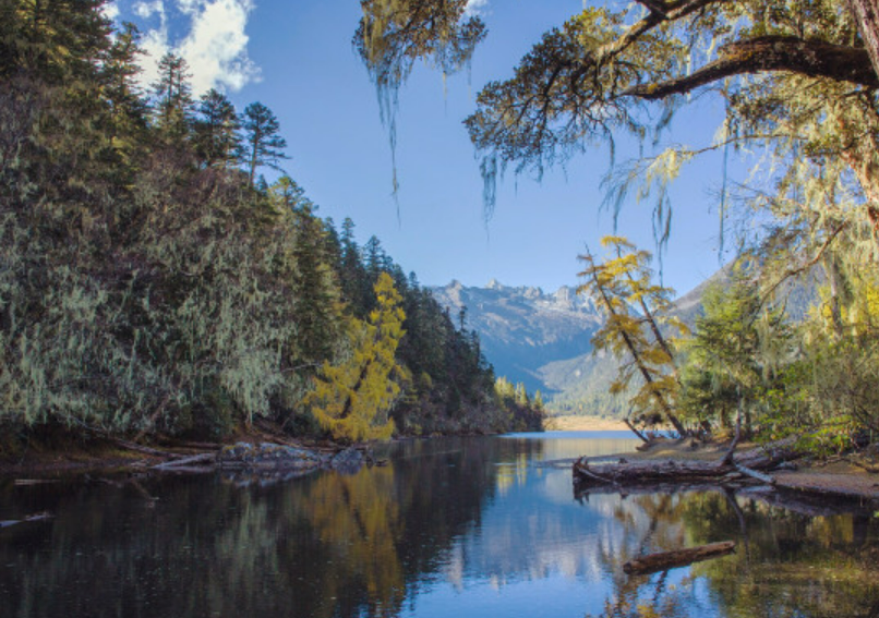春天这里百花盛开,争奇斗艳,古树盘根错节,藤枝攀延缠绕,杜鹃树伸向水面。5月的时候满山遍野都盛开着五颜六色形态各异的野花,尤其是成片成林的高山杜鹃,主要有白色和粉红两种,热热闹闹地竞相开放。