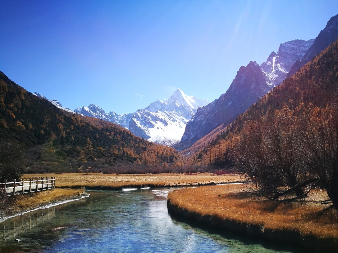洛绒牛场北侧山坡的灌木丛到了秋季一片通红,而此时夏诺多吉山脚下的落叶松林也是层林尽染,红、黄、蓝构成了“香格里拉之魂”最简洁而又内涵丰富的色彩,晴朗的白日都能拍摄。
