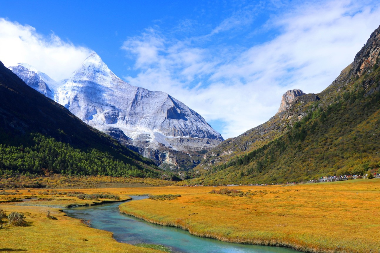 藏语意为:“文殊菩萨”,为“三怙主”雪山的南峰,海拔高度为5958米,在佛教中排在“三怙主”雪山之首。文殊菩萨在佛教中是有智慧的化身,雪峰像文珠师利用手中的智慧之俞直指苍穹,冰晶玉洁的央迈勇傲然于天地之间。一九二八年,洛克先生在去南与稻成毗邻的群山重岭中,遥望见了央迈勇,被她高贵的气质折服,在他的日记中写到“她(央迈勇)是我见到世界上最美的山峰。”站在央迈勇神峰下,转身向后瞧去,由群册环绕着宽阔峡谷间,森林、草地、溪流和睦地各守一方,这气势莽莽的自然景观,就是人间仙境吗!就是香格里拉所在吗,真是让人感慨万千。