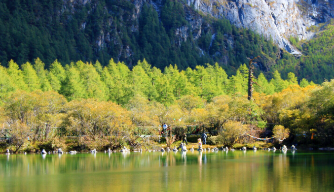 珍珠海在仙乃日的脚下,从冲古寺上去也就20分种的路程,隐藏在一片小树林后的它是那样的安静,但却是那样的迷人。去珍珠海是在早上,没什么人。严格意义上说珍珠海只能算是一个大一点的水潭,碧绿的水色在清晨天空的映射下发着幽幽的光芒,仿佛就是一块跌落在人间的深色翡翠。湖水正好倒影着仙乃日的雄姿,虽不全,但也足以让湖水沾上点神山的灵气,生机勃勃起来。总认为这样的环境是让人思考的好地方,当真的能做到心的平静能像这一泓秋水般波澜不惊,也许就真的能听到神。