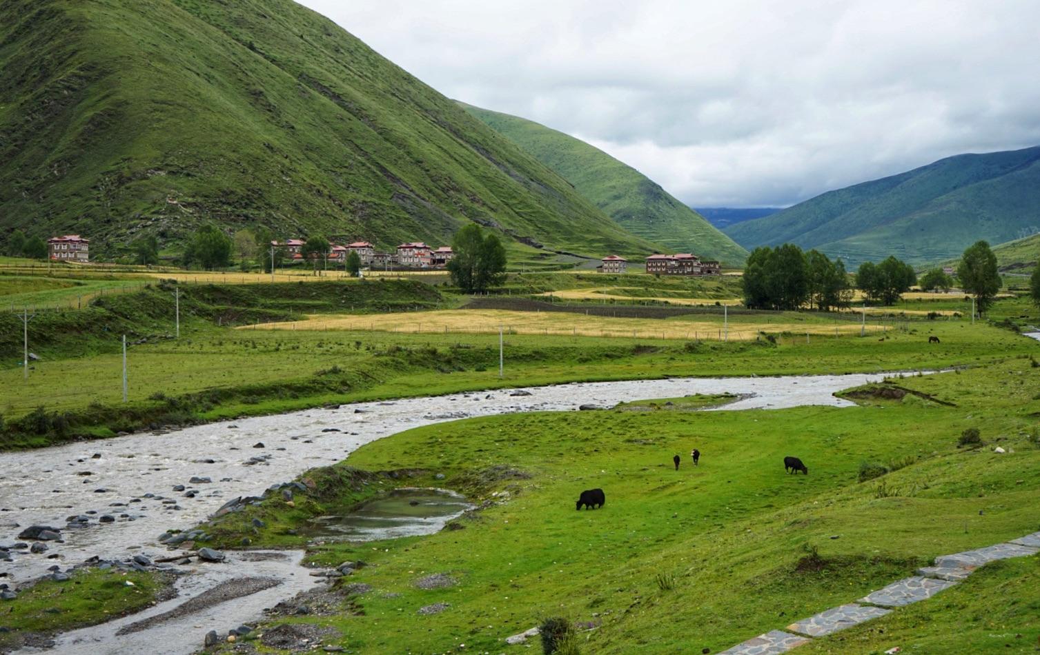 新都桥(又叫东俄罗),海拔3300米左右,高原气候,温差较大,气候多变,初次上高原的朋友可能有不同程度的高原反应。它是川藏线南北分叉路口,北通甘孜、南接理塘,是从西藏通往康定的必经之路。距离成都437公里,距离康定城80公里,途中要翻越海拔4298米的折多山,可远眺蜀山之王--贡嘎山。沿着川藏公路南线前行,只见一个个典型的藏族村落依山傍水地散布在公路两旁,一条浅浅的小河与公路相依相偎地蜿蜒流淌。房前路旁矗立着一棵棵挺拔的白杨,在秋风秋阳中炫耀着特有的金黄。 一群群的牦牛和山羊,点缀在新都桥田园牧歌式的图画中,平添出许多生动。远处的山脊,舒缓地在天幕上划出一道道优美的弧线。