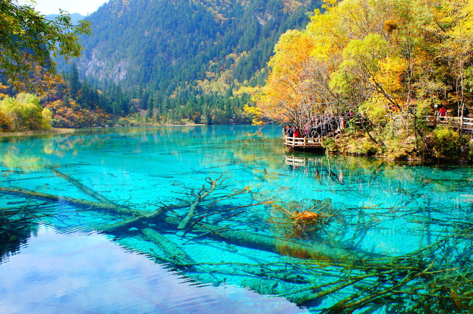 乘坐景区环保观光车可抵达长海后,下行约一公里即可到达五彩池。五彩池色彩丰富,是摄影爱好者的最爱,一定要在有阳光的时候,光影斑驳的样子才最漂亮。