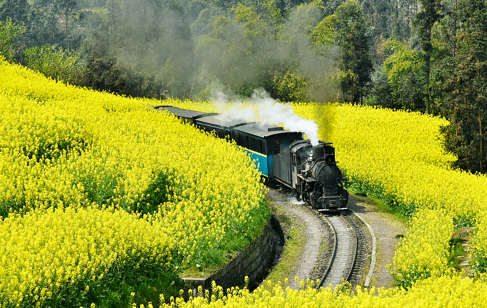 嘉阳小火车距离成都2.5小时,每年三2月到3月,这里遍地的油菜花🌼,小火车🚂穿行在金色花海里,清风拂过的菜籽花香,比千与千寻的小火车还要美妙。还有废弃的蒸汽火车,作为摄影师取景是非常不错的,这里,已经成为每年春天必去的地点之一嘉阳小火车既能体验蒸汽小火车,又能欣赏成片的油菜花。3-4月为最佳旅游时间,因为这时候漫山遍野的油菜花开得正盛。