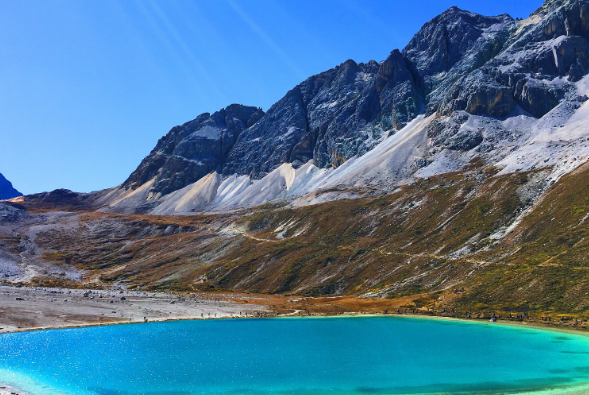 牛奶海,又叫俄绒措,古冰川湖,状如水滴,四周雪山环绕,湖水清莹碧蓝,山止成瀑,以其玲珑秀雅水色翠蓝而著名。牛奶海在央迈勇的山坳里,呈扇贝形,中间是碧蓝的雪水,周边则是一圈乳白色环绕,这圈乳白色大致就是牛奶海名称的由来。