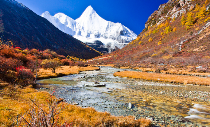 洛绒牛场是亚丁景区内最著名的住宿地点之一,被“日松贡布”三座神山环绕,贡嘎河从草场穿梭,林间溪流潺潺,与牧场木屋交相辉映,构成了一幅原始而又迷人的景色,令人们进入返朴归真的境界。 5月时草长鹰飞,风吹草低现牦牛,又背靠三座神山仙乃日、央迈勇、夏诺多吉,是观看三座雪山的好地点。