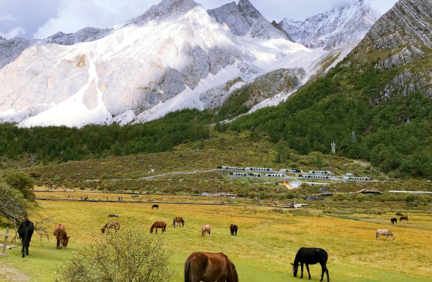 洛绒牛场是亚丁景区内最著名的住宿地点之一,被“日松贡布”三座神山环绕,贡嘎河从草场穿梭,林间溪流潺潺,与牧场木屋交相辉映,构成了一幅原始而又迷人的景色,令人们进入返朴归真的境界。