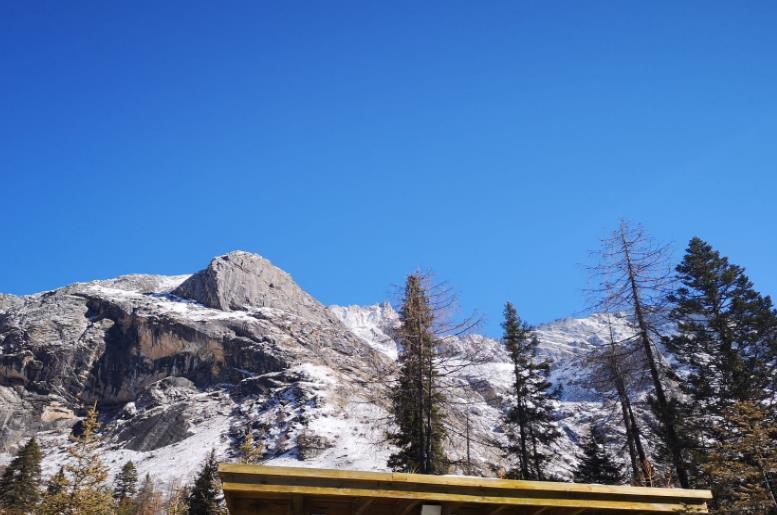 五色山是双桥沟境内最具特色的山之一,距离双桥沟沟口约8千米左右,海拔4800米。远眺过去,像半轮刚刚升起的下玄月,冰雪覆盖在山上,仿佛清辉闪动;又如一颗被砍伐后的千年古树,圈圈年轮清晰可见。