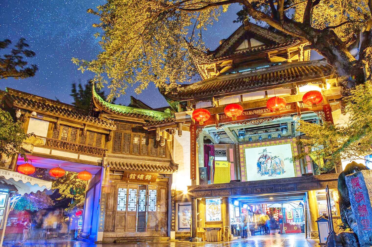 百年木板门,千载石板路。漫游锦官故里,争仰蜀相遗徽。射弩、织锦、客栈,铜锣声声,追寻逝水年华;刺绣、竹编、当铺,花轿悠悠,勾起尘封记忆。结义园中,两碗绿茶尝川剧;诸葛井里,一眼碧水映风云。兰布幌子,远摇百种锦图;红纸灯笼,近照三国食阵。大浪淘沙,历史品味 。老街耶?网络空调,尽领时代风骚;新景耶?窗花石刻,昭示传统渊源。