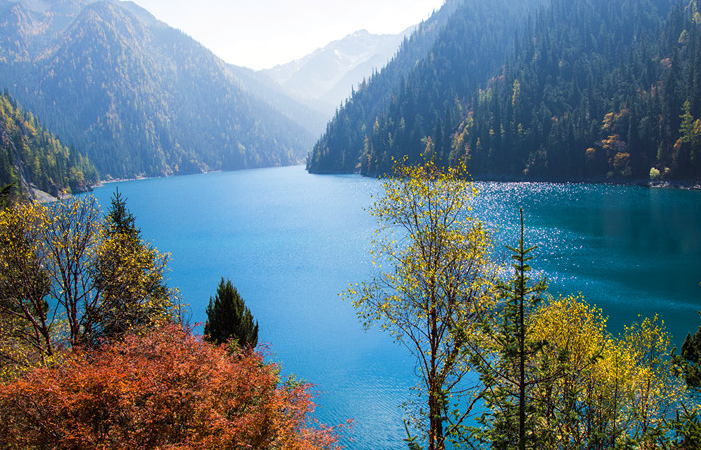 三、翠海九寨沟的湖水终年碧蓝澄澈,明丽见底,而且随着光照变化、季节推移,呈现不同的色调与水韵。一湖之中鹅黄,黛绿,赤褐,绛红,翠碧等色彩组成不规则的几何图形;相互浸染,斑驳陆离。百余个湖泊,个个古树环绕,奇花簇拥。