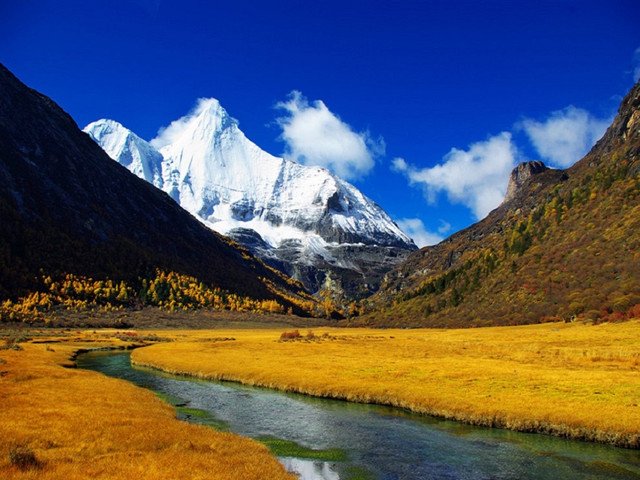 洛绒牛场贡嘎河从草场穿梭而过,林间溪流跳跃,水声潺潺,高高低低的树木与一间间木屋相映成趣,是附近藏族村民的天然高山牧场。草场中央有大片的沼泽湿地,湿地中又分布着无数个的小水洼,清晨日出之时,这些水洼将央迈勇倒映成纯粹的金黄。停驻于此,你会看到成群结对的牛羊,如棋子般点缀于草坪之上,或立或卧,或奔跑或静立,享受着大自然赐予的悠闲时光。