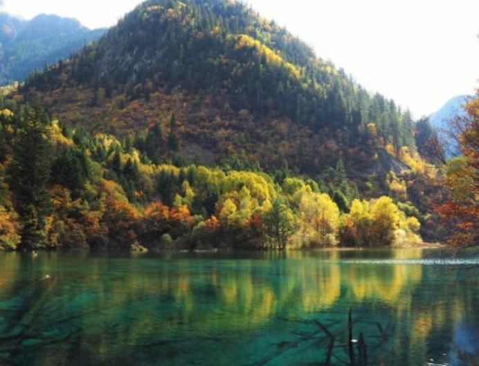 五花海由于海底的钙华沉积、各种颜色的藻类以及岸边五彩的林木倒影而呈现出五颜六色。五花海西侧栈道是最佳观赏点之一,栈道的终点便是五花海的出水口,是彩叶最集中的区域。