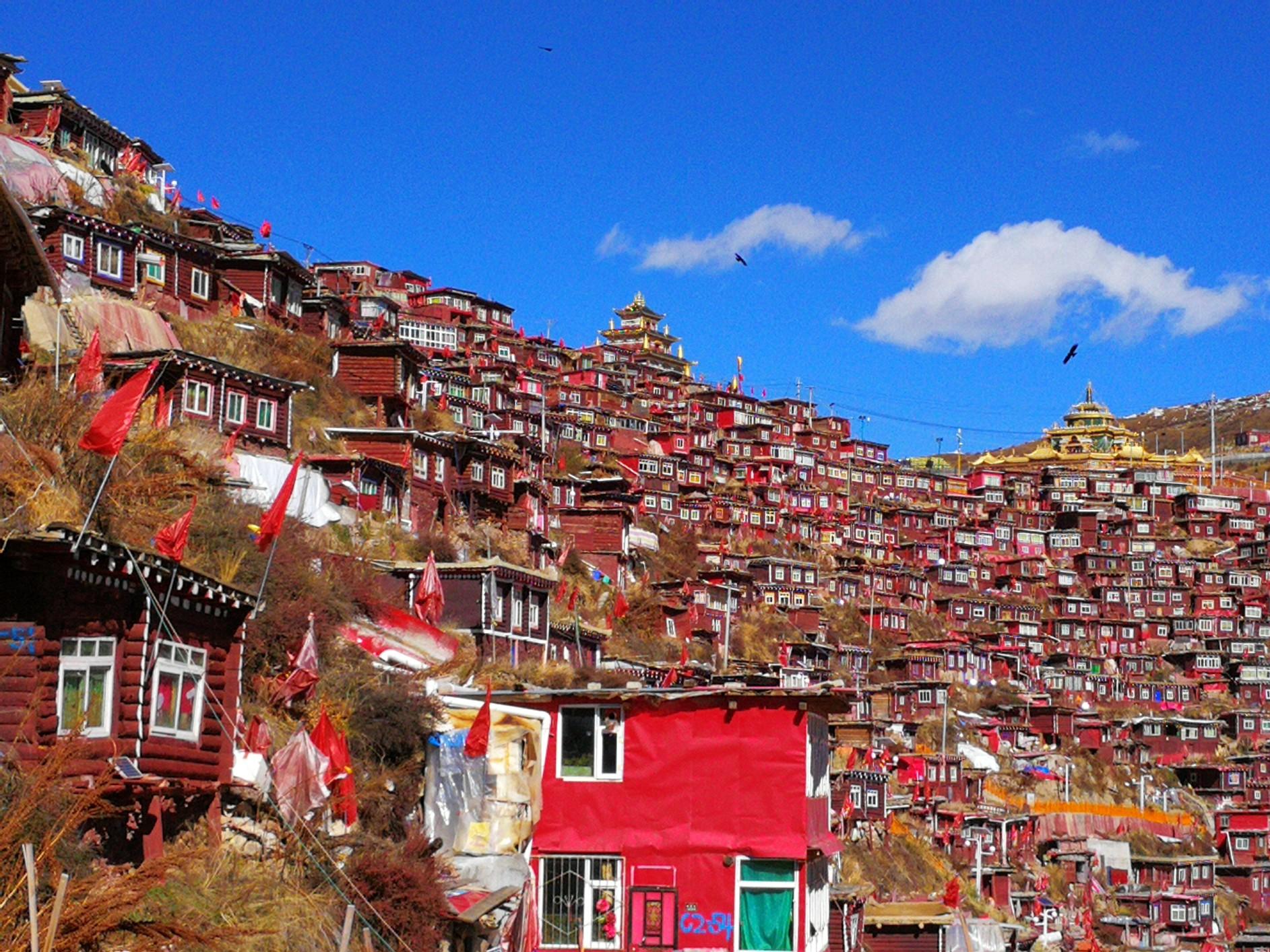 色达佛学院在重重的群山环绕之中,沟里的僧舍,以佛学院的大经堂为中心,密密麻麻搭满了四面的山坡,不计其数的绛红色小木屋,延绵无数,一眼望不到头。