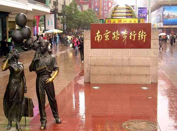 南京路步行街采用不对称的布置形式,以4.2米宽的“金带”为主线,贯穿于整条步行街中,“金带”上集中布置城市公共设施,如坐椅、购物亭、问讯亭、广告牌、雕塑小品、路灯、废物箱、电话亭等,并设有34个造型各异的花坛。