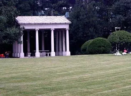 说起来,静安公园还是一个历经沧桑变化的地方。光绪二十四年(公元1898年),公共租界工部局在此建造静安寺路公墓,俗称“外国坟山”。1953年,市政府将公墓改建成公园。在这次改建中,只保存了一座大理石亭。亭子为西式建筑风格,颜色呈白色,正方形,属石混结构;人字型缓坡顶,12根罗马爱奥尼式柱支撑;柱顶与檐接点处有装饰物,柱根有方柱作底座;白色大理石铺地面,并四周分别有三节台阶;亭内有大理石方桌和长条大理石凳。大理石亭记录了静安公园曾经的变迁,具有一定的历史价值。