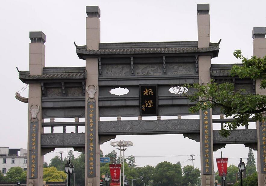 这是一座规模较大保存完好的古镇,古镇入口处伫立着一座高大、挺拔的石牌坊,牌坊梁柱上雕刻着精致的传统花纹,立柱上悬挂着四副镏金字联,坊眉上书“枫泾”二字。