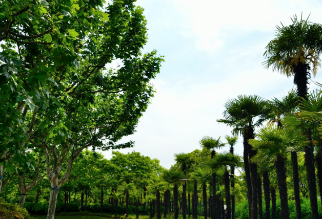 全园种植乔灌木167种12.11万株,乔木与灌木之比1:0.58,常绿树与落叶树之比1:0.46。树木主要以群植、林植方式栽植。东部沿江岸密植乔灌木混交林。道路两侧,水际湖边,采取间断疏植或丛植,形成绿荫覆盖的绿色走廊。在平缓的草地上布置疏林。园的东北地势较高,结合景区要求,林植雪松、香樟、柏树等高大常绿树,以雄伟的树姿增强山林峻峭气势。其他地区结合地形和意境,布置以一种乔木为主体的树群、树林,形成大小、高低和郁闭程度不同的园林空间。