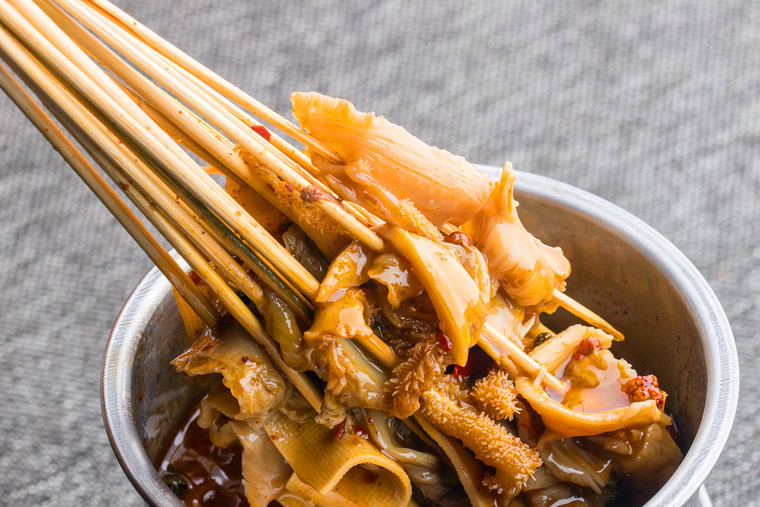 鸭颈、鸭膀、鸭肫、各种豆制品等咕嘟咕嘟地在大锅小锅里煮过,每样都带着淋漓尽致的酱油光泽,最便宜的一元一串,老街的很多店铺都有卖。