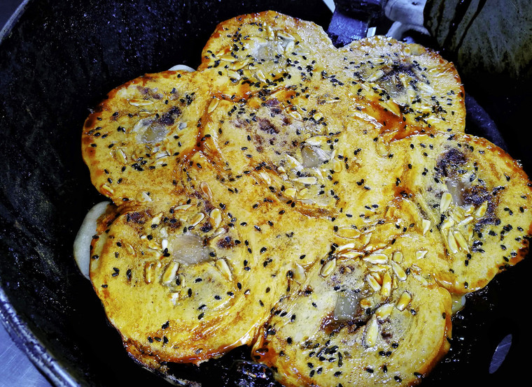 老上海的葱油饼是七宝的人气美食之一。要趁刚出炉的时候吃最好吃,一口咬下去,皮酥酥的,葱香嘣在嘴里的清香直闯脑中枢神经,味道棒极了。