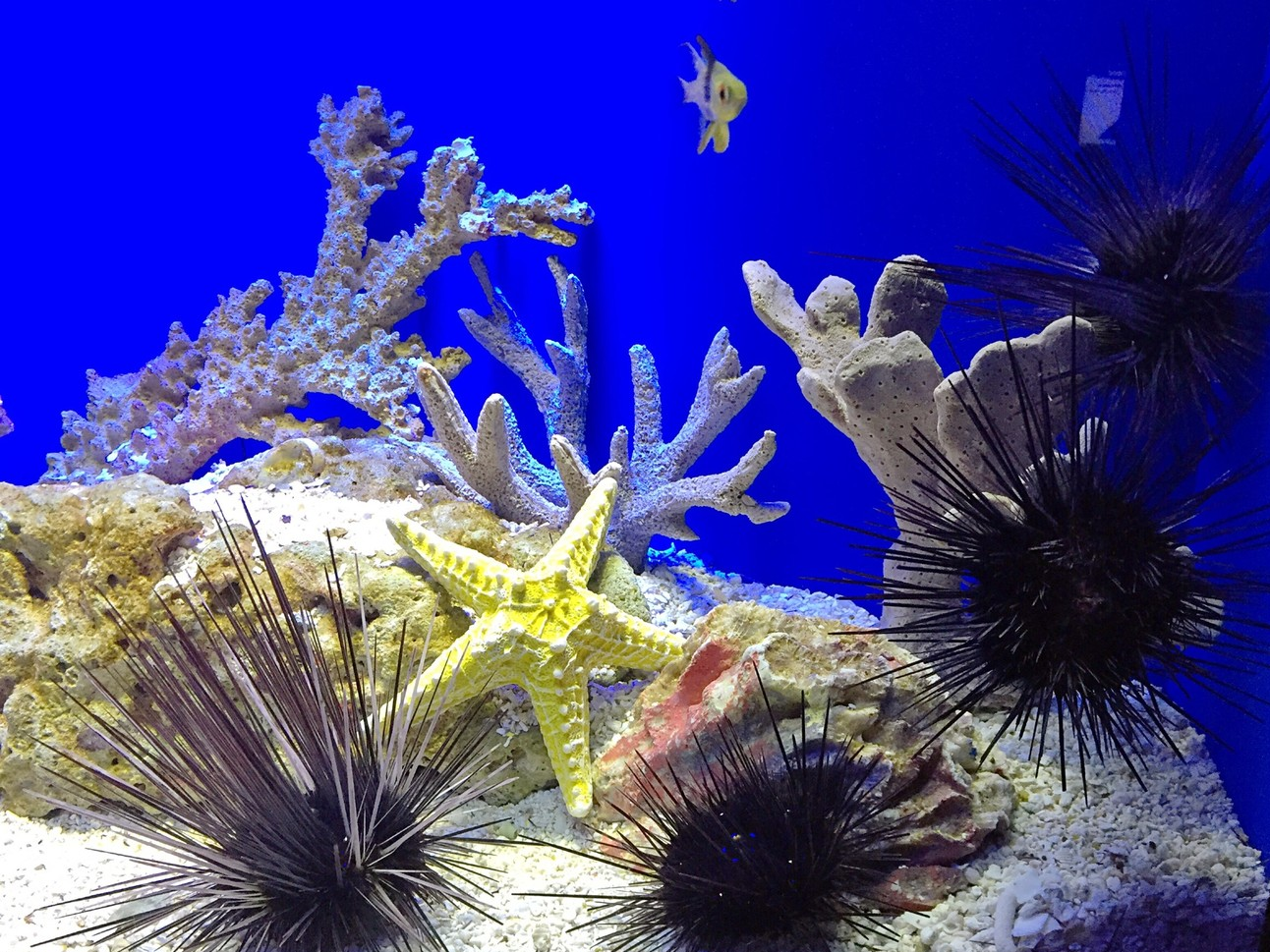 水族馆除了展出世界上有特色的淡水及海洋生物外,最有特色的展示草海龙、缎带海龙、水母、企鹅、斑海豹、沙虎鲨、扬子鳄的雕像、中华鲟等世界珍稀品种。除了展示来自五大洲、四大洋水生物外,还特别设置了介绍各大洲人文、地理环境的序厅。展出空间以装饰、主题、图案和音响展现不同区域鱼类原产地国家的地理、人文风貌。