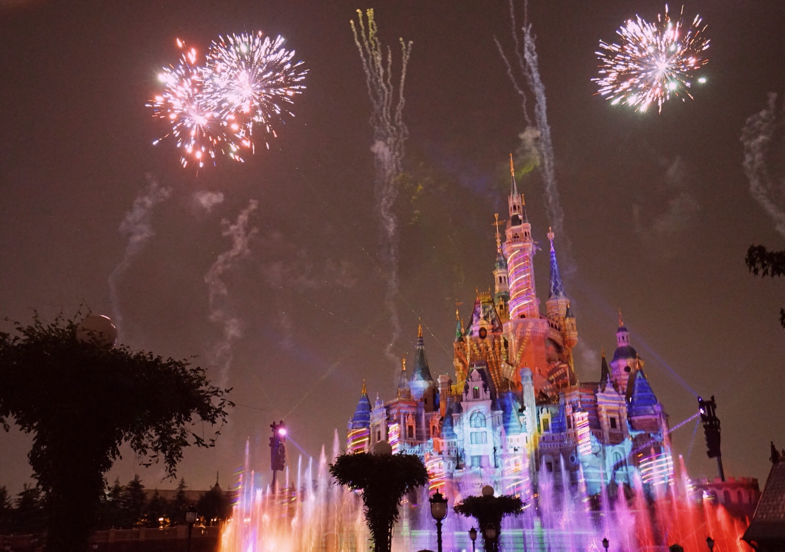 夜光幻影秀通过扣人心弦的投影、激光、喷泉及其它各种特效技术,米奇将施展魔力将“奇幻童话城堡”变为梦幻新世界。星空下,数枝烟花腾空而起,瞬间迸射出绚丽的色彩。耳边的音乐响起,一个个经典迪士尼电影画面映射在高大的城堡上,城堡前则是一排跃动的水幕,像是被施了魔法的精灵。城堡不断出现杰克船长,狮子王等迪士尼人物,还有冰雪奇缘主题曲的播放,配合着烟火的盛开开放。