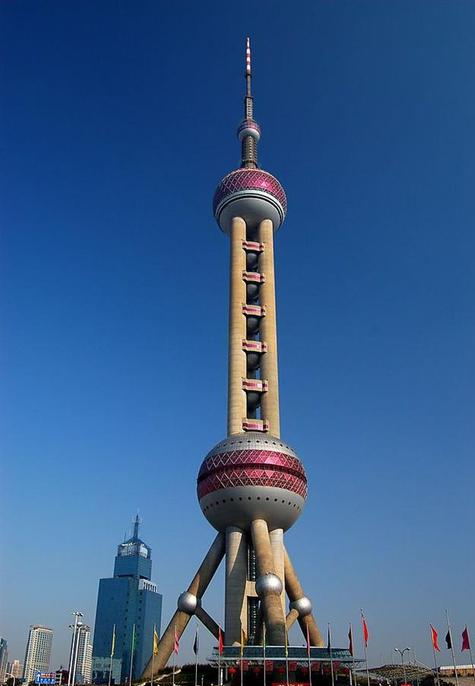 东方明珠广播电视塔(The Oriental Pearl Radio & TV Tower)是上海的标志性文化景观之一,位于浦东新区陆家嘴,塔高约468米。该建筑于1991年7月兴建,1995年5月投入使用,承担上海6套无线电视发射业务,地区覆盖半径80公里。