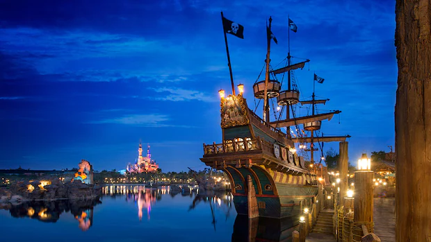 加勒比海盗——沉落宝藏之战“加勒比海盗——沉落宝藏之战”是一趟壮观无比的室内乘船漂流历险。游客将在杰克船长的带领下在欢乐冒险中“偷走”戴维·琼斯船长最珍贵的宝藏。这处游乐项目完美结合迪士尼故事讲述和尖端技术,配以独具特色的三块巨型多媒体穹顶、投影效果、栩栩如生的人物、剧院级的布景以及复杂的光影效果。游客们将畅游海面甚至潜入海底展开一场生动的航海大冒险。安全可控的全新驾乘系统使得海盗船能够完成旋转、侧驶甚至逆行的动作,打造出极具个性化的体验。游客将会遇到勇敢无畏的海盗、美人鱼、甚至北海巨妖。迪士尼获得专利的声音动画技术、机器人科技及最新成果将更加逼真地还原出这些海盗们的故事。