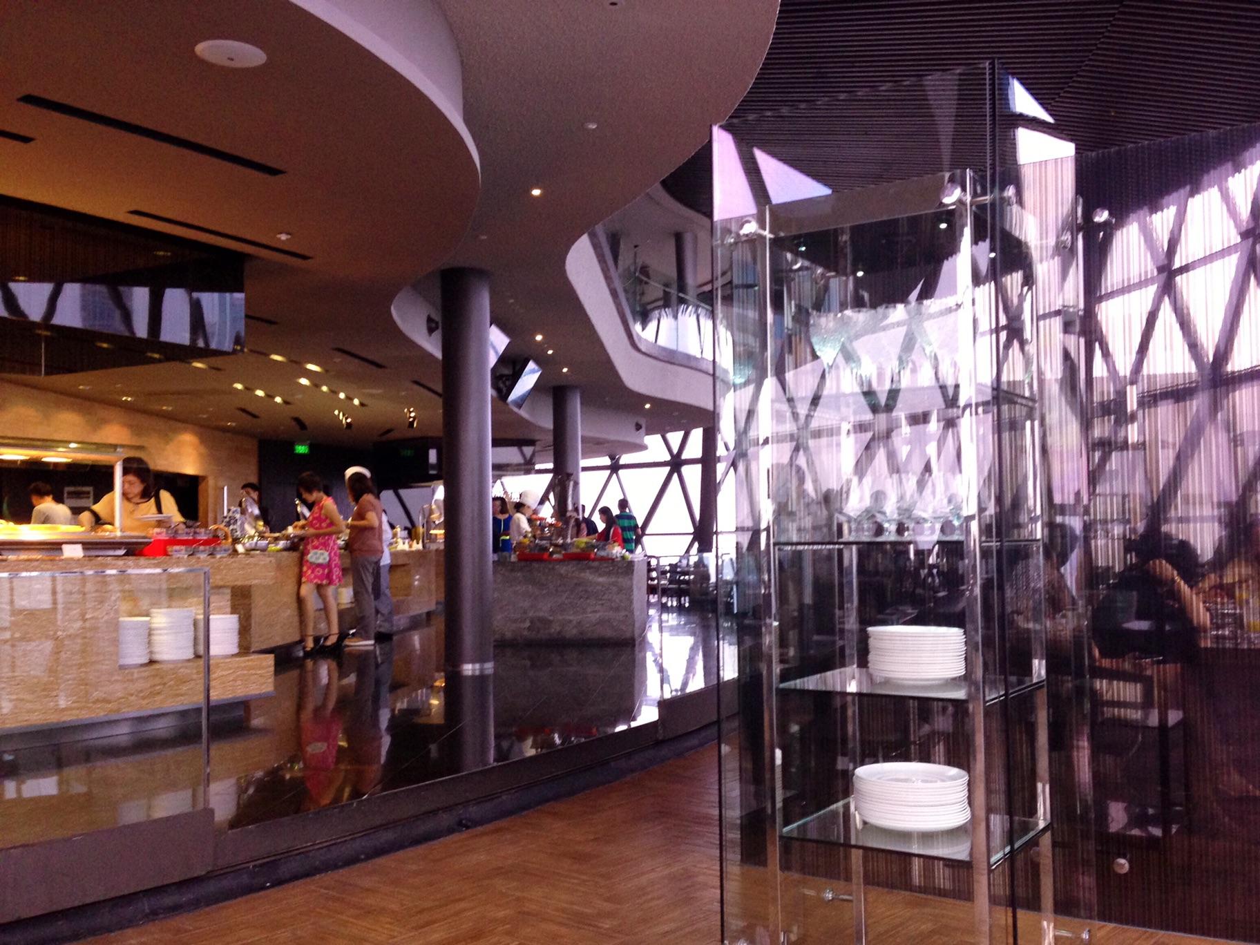 东方明珠旋转餐厅是一个自助餐的餐厅,每2小时旋转一圈的设计,让您360度全方位享受都市美景。菜色的品种很多,餐厅内还有一个酒吧。