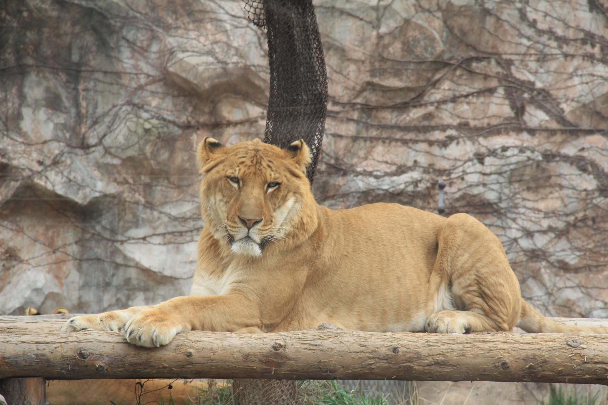 狮虎兽展区内,放养展出一对狮虎兽。狮虎兽属于食肉目,猫科动物,主要是人类影响或主使之下的产物,是雄性狮子和雌性老虎交配产生的后代。